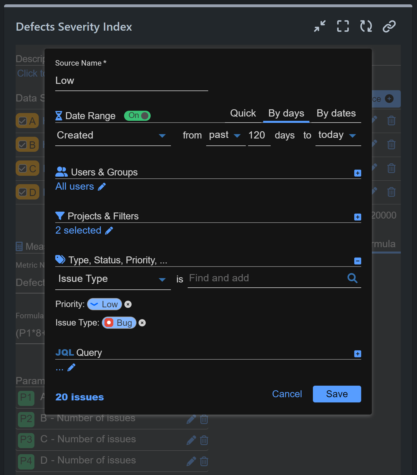 Step 4 in detail: For every metric employed as a parameter in the equation, you retain the flexibility to select the data source. In our sample scenario, we have identified four distinct data sources: Bugs with different levels of priority created within the last 120 days.