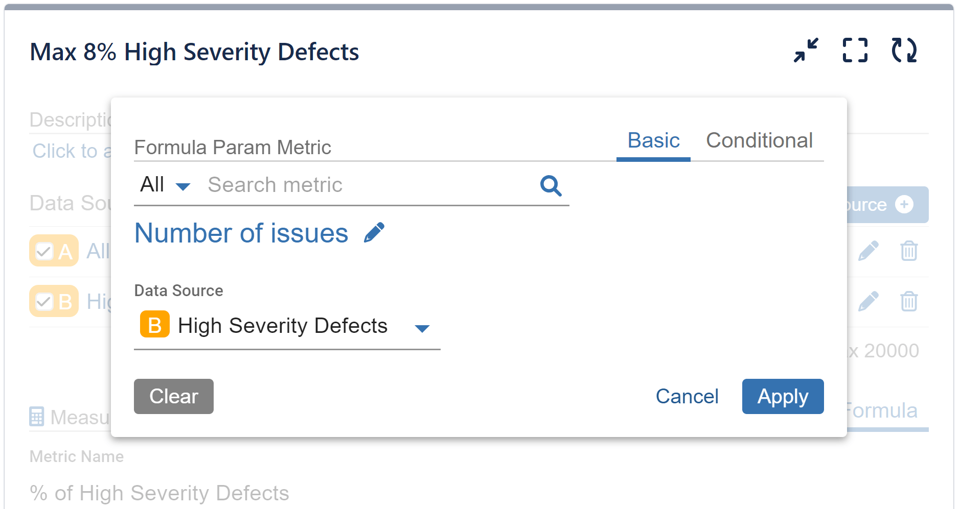 Step 1: Add two data sources. The first, named ‘All defects,’ should cover all bugs. The second, ‘High Severity Defects,’ should exclusively include critical Bugs (in our case high and highest priority).