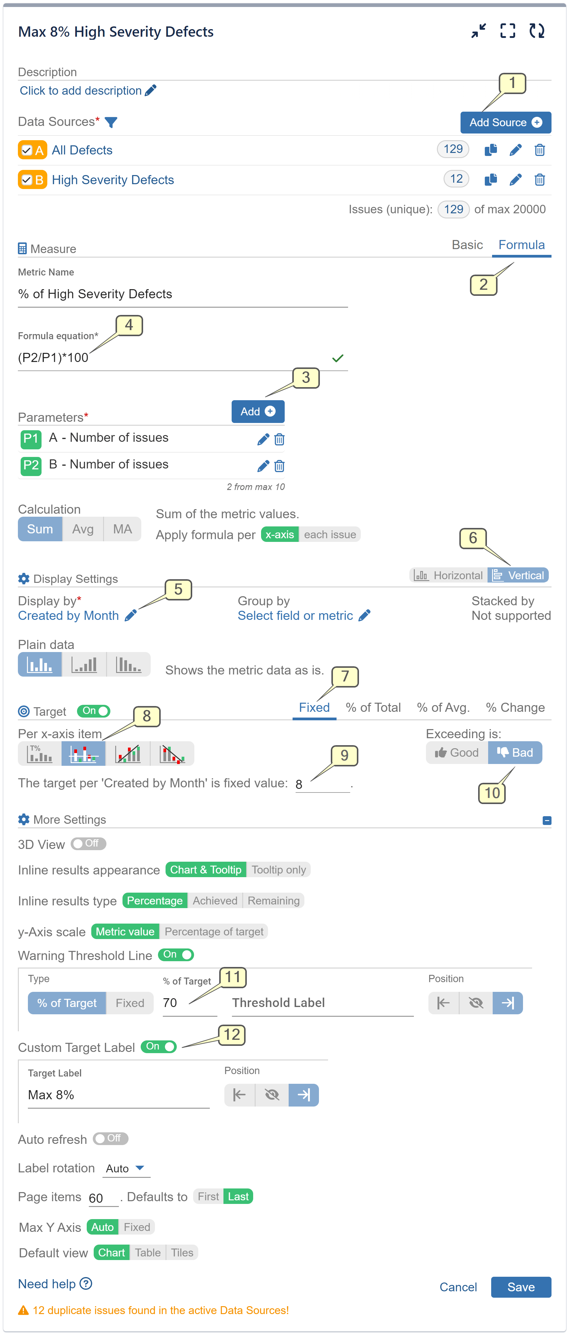 Additional instruction for Step 3: In our scenario, we’ve selected “Number of Issues” for both Parameter 1 and Parameter 2. What’s crucial to note is that each parameter draws data from distinct sources. P1 utilizes data A (All Defects), whereas P2 utilizes data B (High Severity Defects).