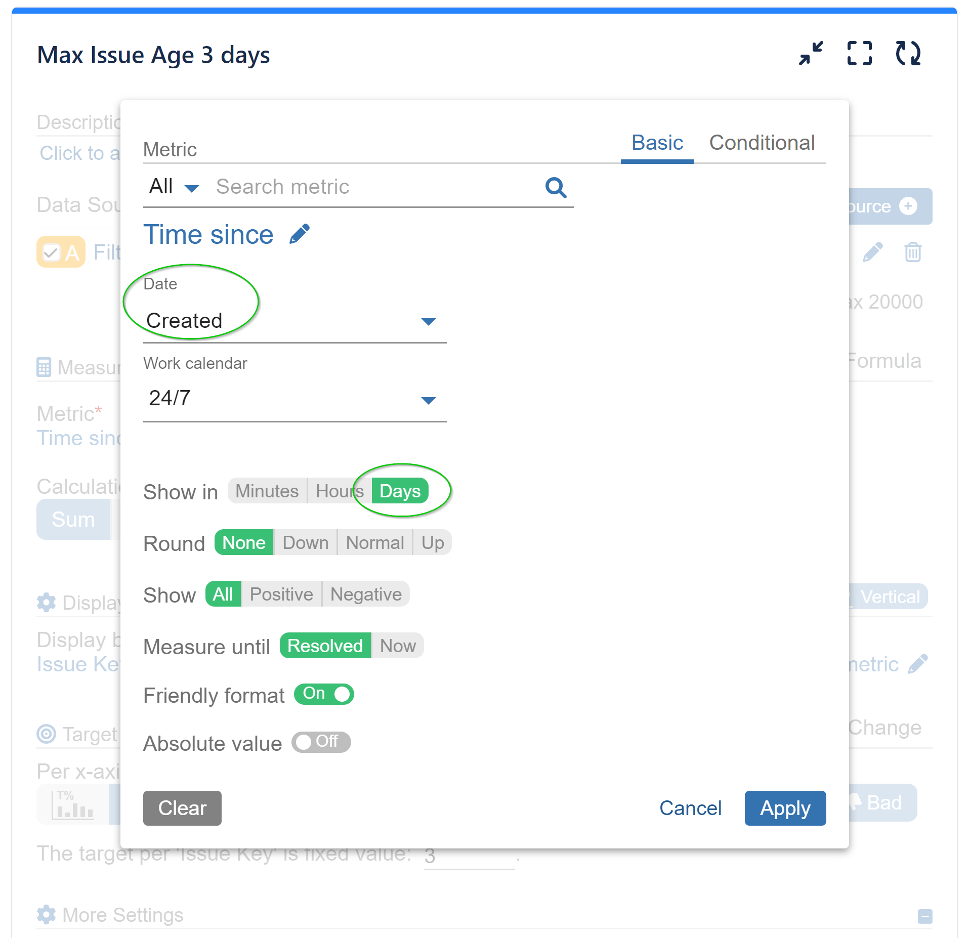 Step 2: Select the metric ‘Time since’ and pick the ‘Created’ Jira date field for ‘Event’. Apply customizations based on your preferences. Please not that the ‘Measure until’ button is set to until resolved by default. You can keep it like this as it won’t affect issue age of open issues, which is the aim of our report.