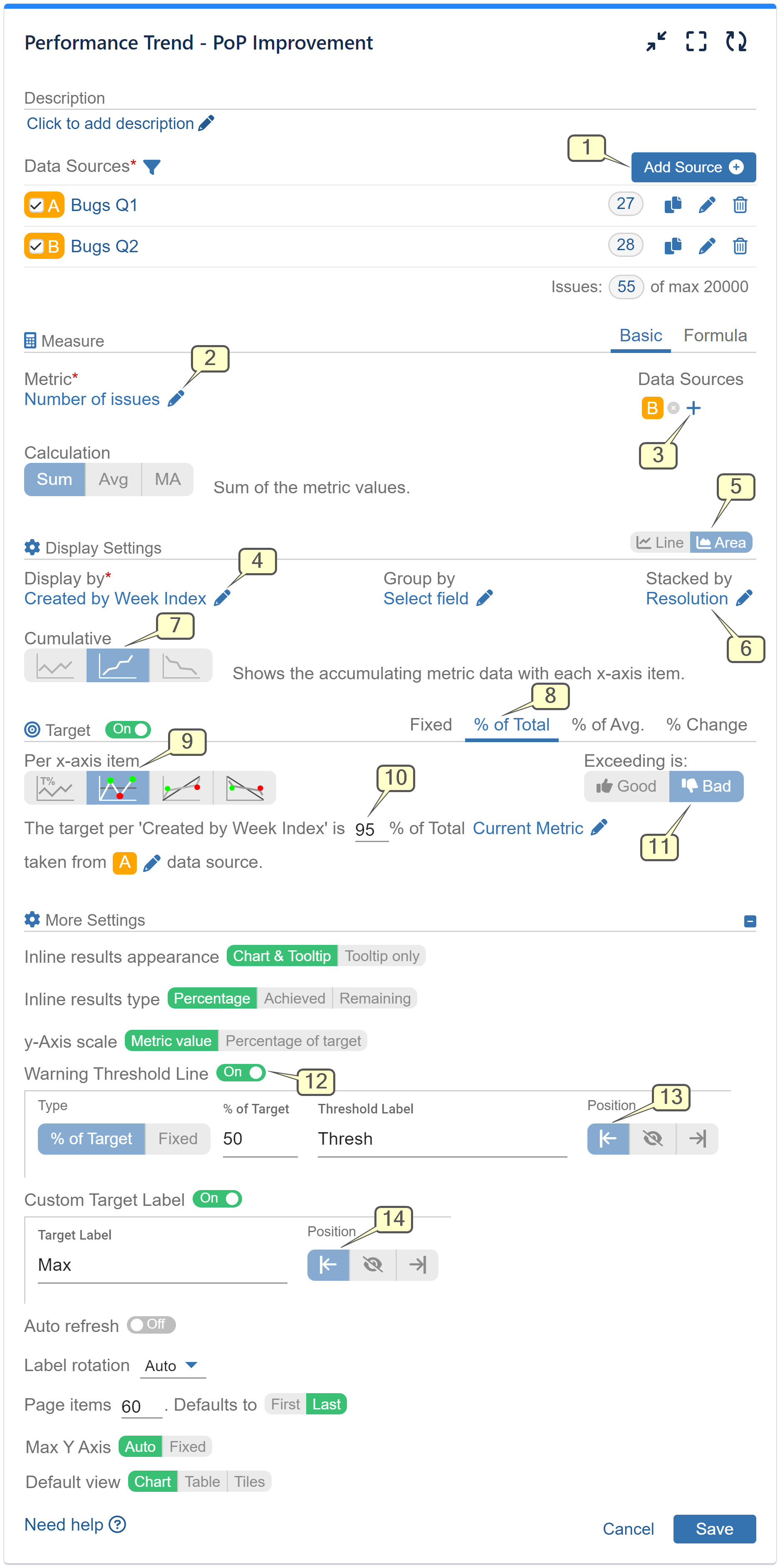 Here’s how to utilize the data segmentation feature of Performance Objectives: Charts for Jira to filter on the “Issue type” Bugs in both of the Data Sources you’ve employed for your PoP improvement comparison report in Jira.